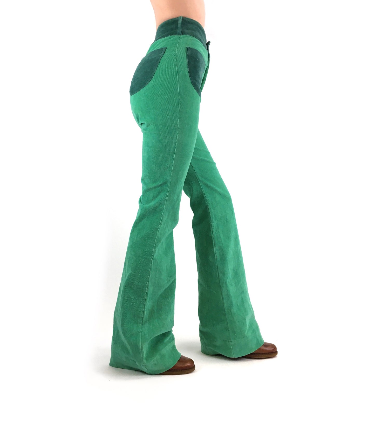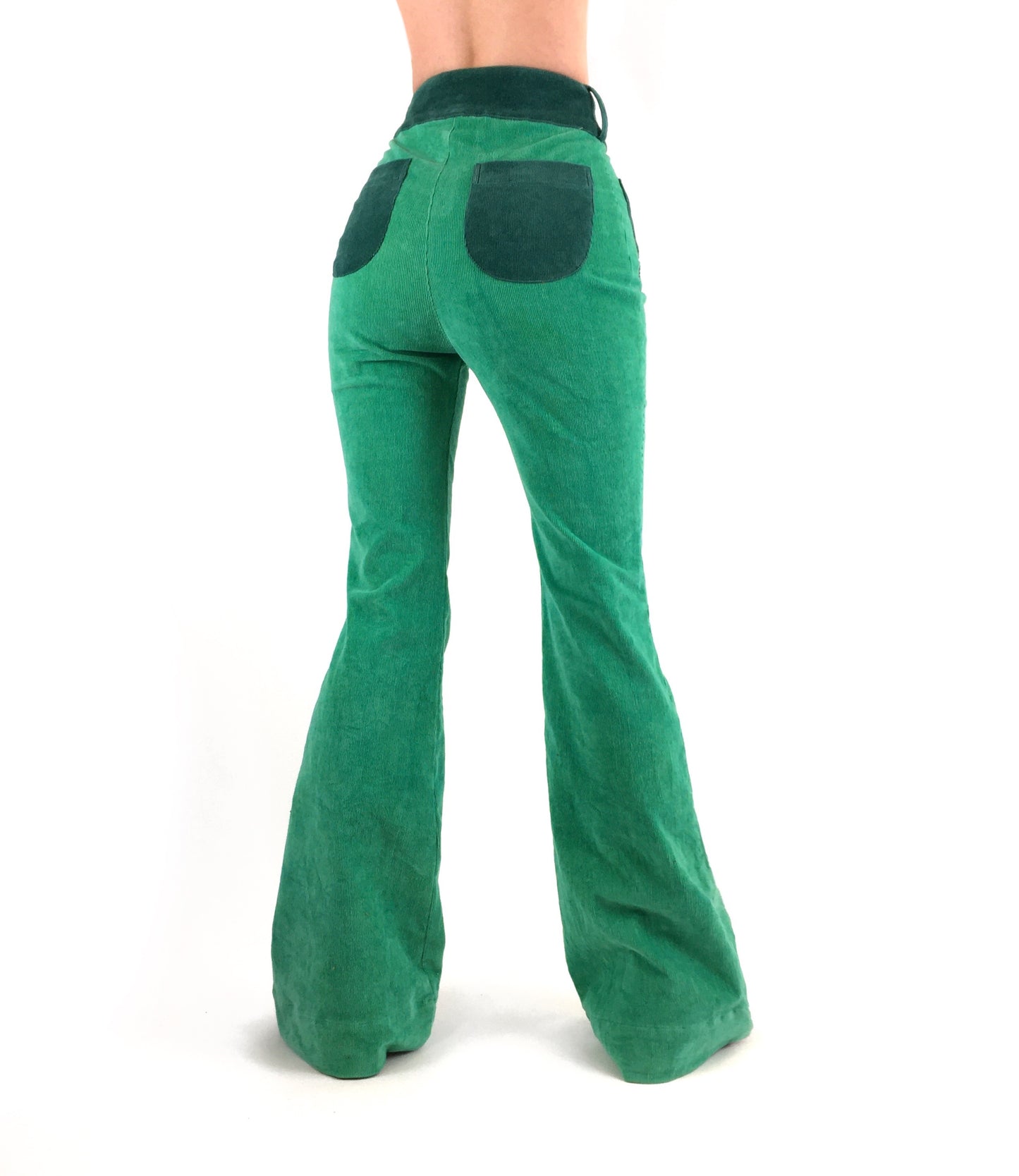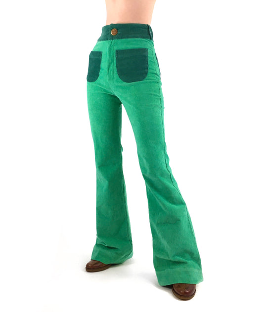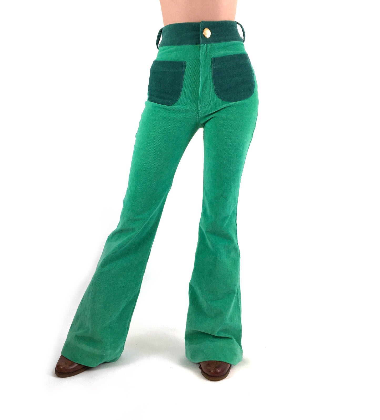 ✿ The Contrast Corduroy Flare Pant in Sea Foam. An oh so dreamy corduroy flared pant inspired by 70s streetwear. Features a figure flattering high waist with zipper and button closure, contrasting brown corduroy front and back pockets and belt loops at either side to accommodate your funkiest belts. Made from 100% soft cotton. Model is wearing a Size XS for reference and is a UK 4 - US 0✿